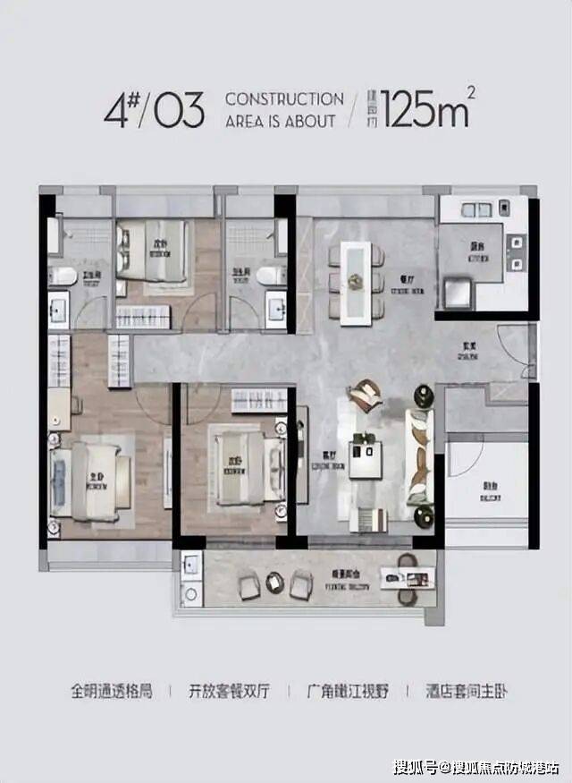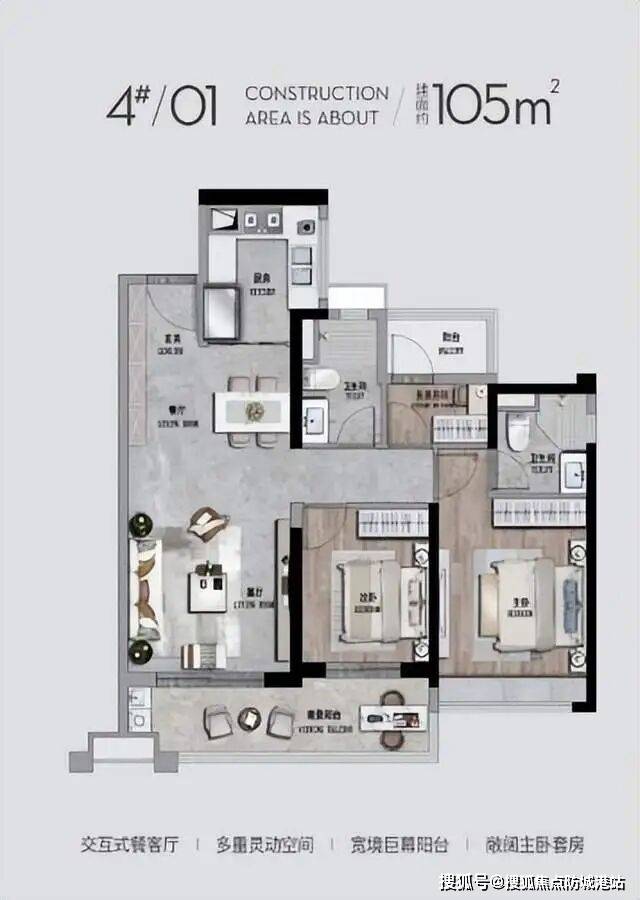 1. 105㎡三房两厅两卫:这款户型是项目的入门级户型,适合注重品质的刚需家庭,或者想在金融岛布局资产的投资者。户型方正,户户朝南,全明采光,南北通透,动静分区合理;客厅连接观景阳台,能欣赏到园林景观,部分高层户型还能看到江景;主卧套房设计,配备独立卫生间,保证业主的隐私;两个次卧空间充足,能满足家人的居住需求;厨房U型设计,操作方便,实用性强。根据官方备案价格,这款户型总价约280-300万,首付约84-90万,性价比很高。