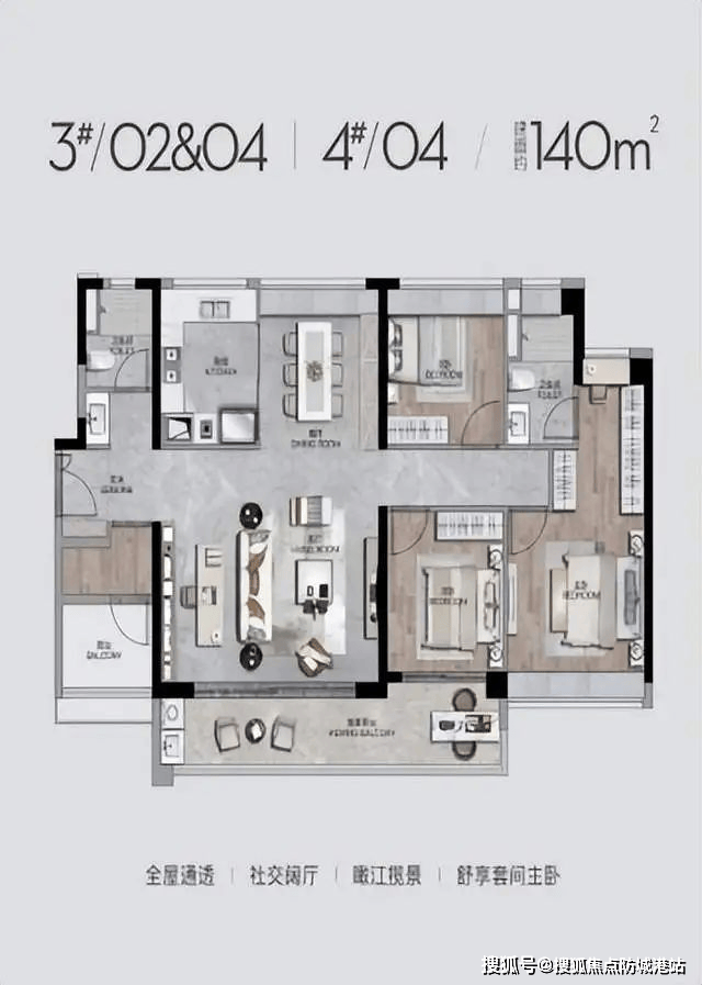 3. 140-160㎡四房两厅两卫:这款户型适合多人口家庭,比如三代同堂,或者有两个孩子的家庭。户型南北通透,全明采光,动静分区合理;四房设计,空间充足,每个房间都有窗户,没有暗间;客厅连接超大观景阳台,江景视野极佳;主卧套房设计,配备独立卫生间、步入式衣帽间和观景飘窗,居住舒适度极高;两个次卧空间充足,还有一个书房,能满足家人的办公、学习需求;厨房U型设计,操作方便,实用性强。这款户型总价约380-450万,首付约114-135万。